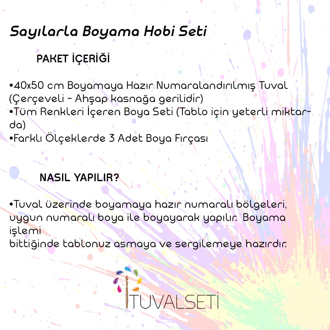 Kendi sanat eserini yaratmaya hazır mısın? Tuval Seti sayılarla boyama seti ile hiçbir deneyime gerek olmadan profesyonel tablolar yapabilirsin! Her kutu, 40×50 cm boyutunda yüksek kaliteli tuval, numaralandırılmış akrilik boyalar ve çeşitli fırçalar ile birlikte gelir. Tuval üzerindeki numaralı alanları karşılık gelen boyalarla doldurarak adım adım muhteşem bir tabloya imza atacaksın.